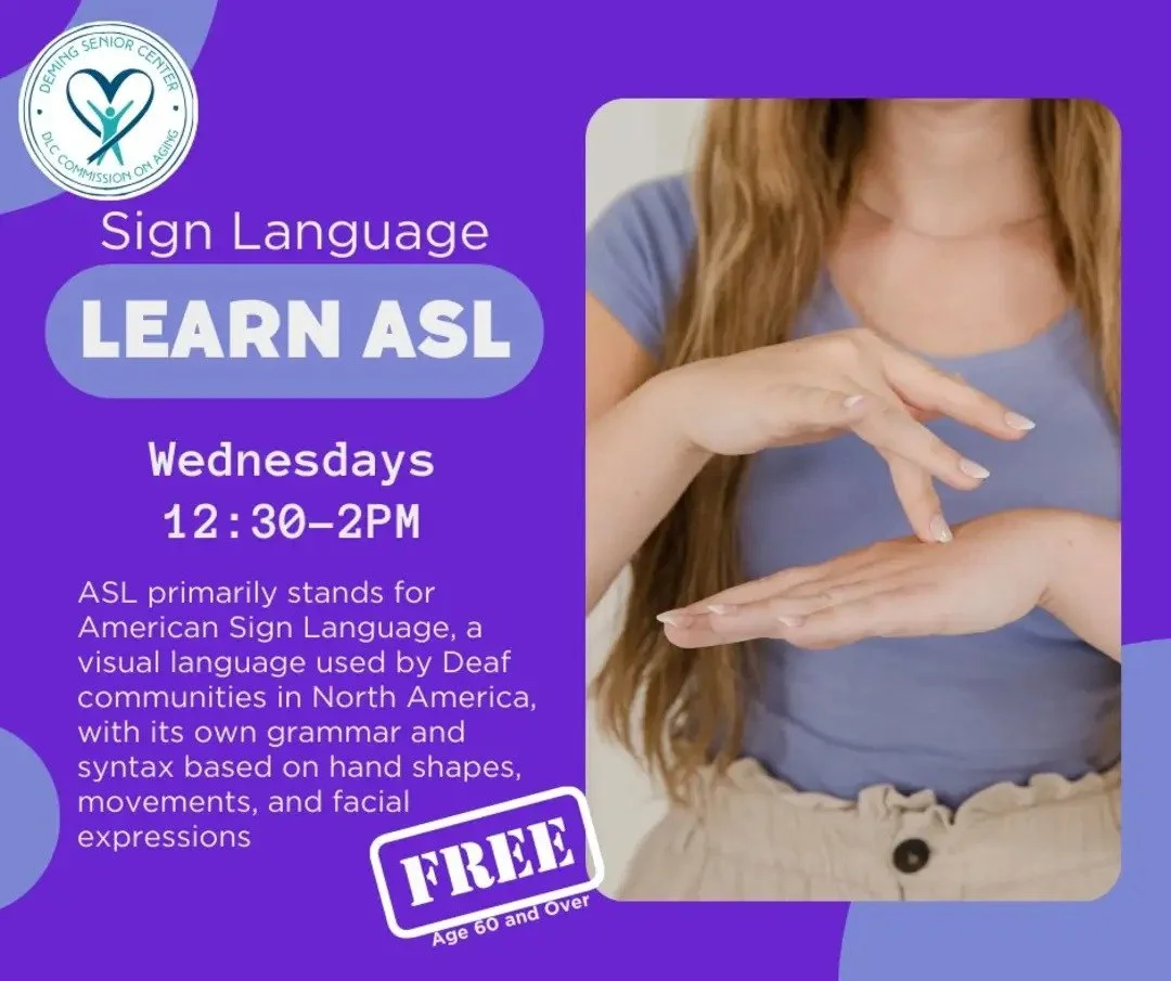 The Senior Center offers a free American Sign Language class every Wednesday from 12:30 p.m. to 2:00 p.m. for adults age 60 and older. This class introduces participants to ASL, a visual language used by Deaf communities, with a focus on hand shapes, movement, and facial expression. Learning ASL supports cognitive health, communication skills, and inclusive community engagement in a welcoming and supportive environment.