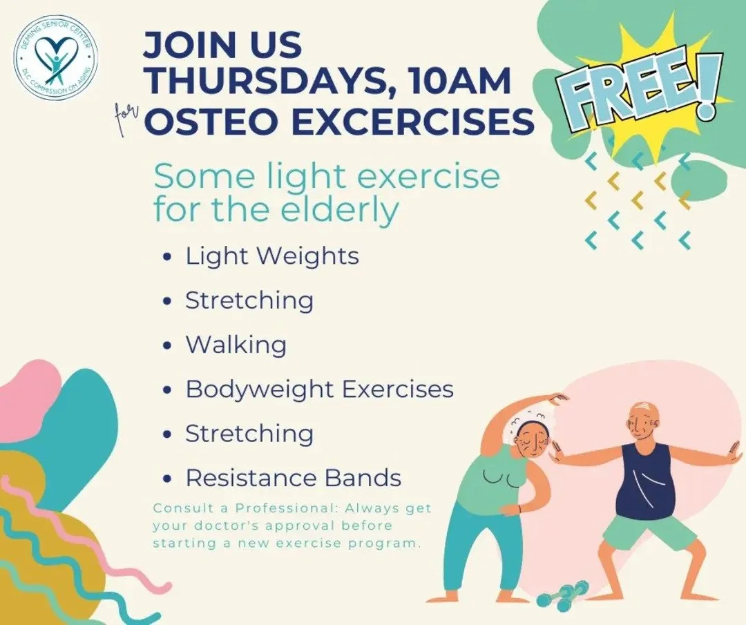 The Senior Center offers free Osteo Exercises every Thursday at 10:00 a.m. for adults age 60 and older. This gentle fitness class focuses on light weights, stretching, walking, bodyweight movements, and resistance bands to support bone health, strength, and mobility. Exercises are designed to be low impact and accessible, helping participants stay active while reducing the risk of injury. Participants are encouraged to consult their healthcare provider before beginning a new exercise program.
